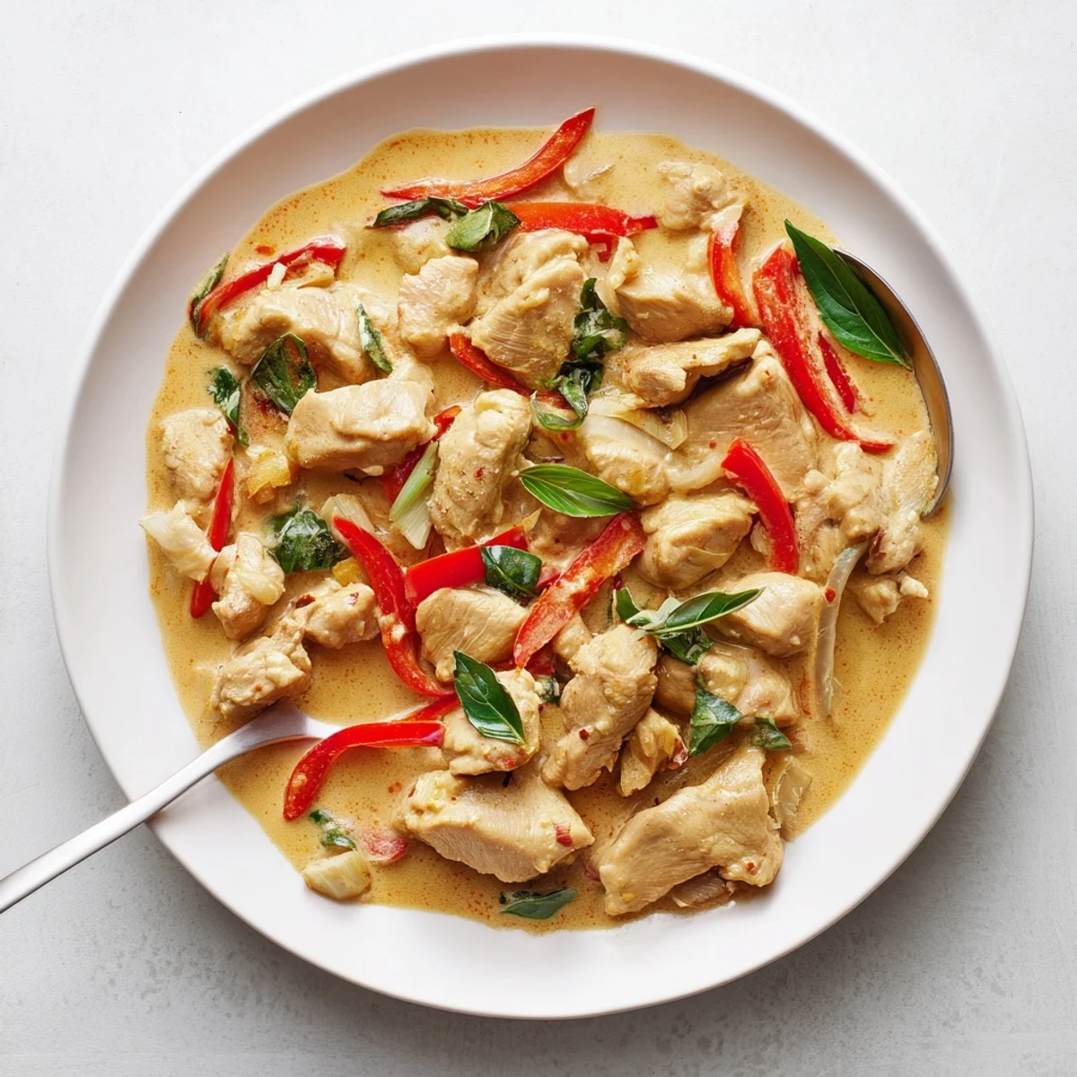 This Thai-inspired curry features tender chicken pieces simmered in a rich, fragrant coconut curry sauce. Fresh basil adds aromatic herbal notes while red curry paste provides gentle heat and vibrant color. The creamy sauce balances perfectly with tangy lime juice and savory fish sauce.