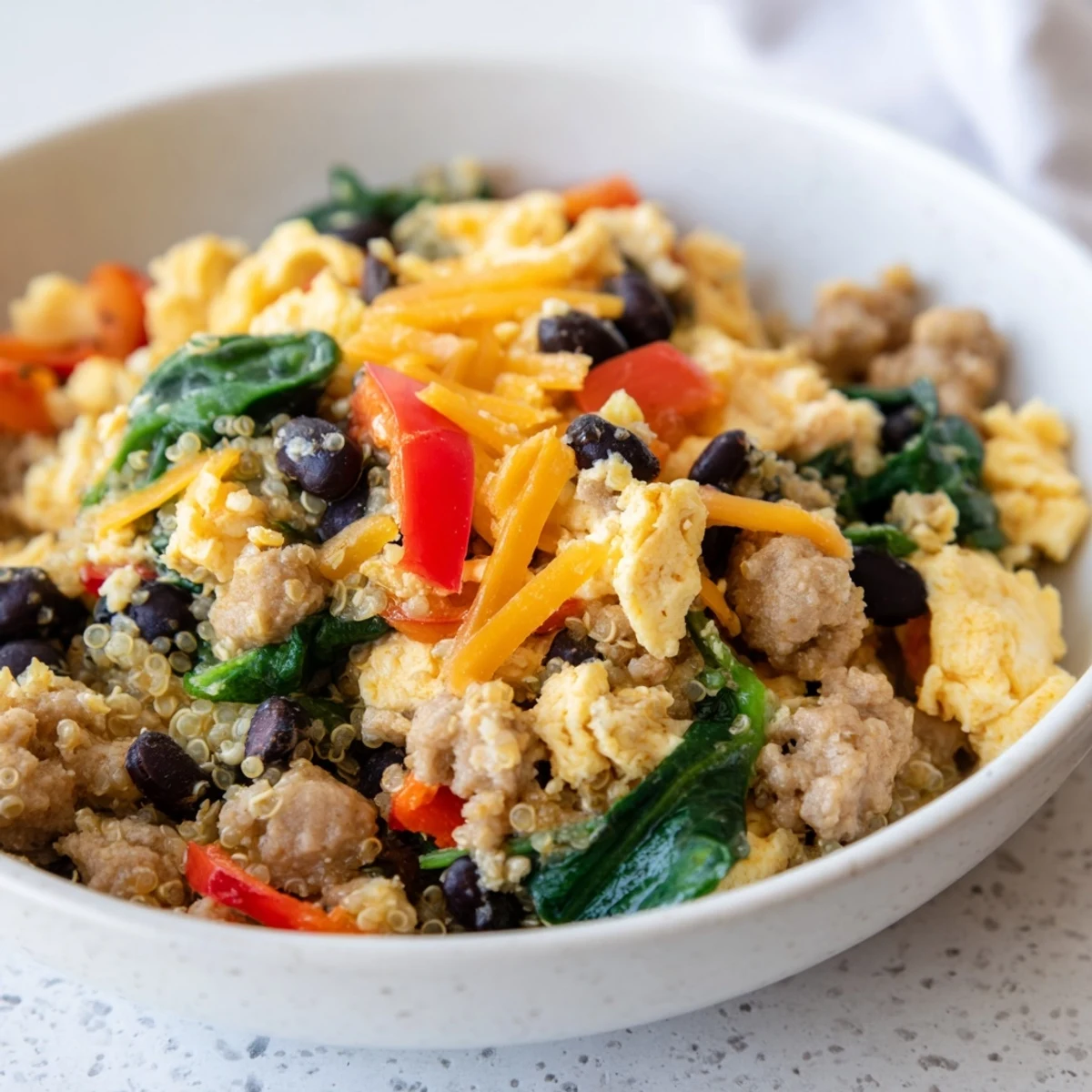 Absolutely. Replace the turkey sausage with plant-based sausage crumbles, extra black beans, or tofu scrambled with the same seasonings. The protein content remains substantial thanks to the eggs, beans, and quinoa base.